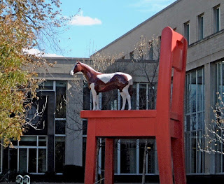 DENVER, COLORADO: CIVIC CENTER PARK OUTSIDE PUBLIC LIBRARY: “The Yearling” is a whimsical 21-foot tall, 10-foot wide, red painted steel chair with a 6-foot tall. fiberglass, painted pinto pony standing atop it. It has been said that the size of this work is said to recall that time in life when even everyday objects seemed monumental. Its creator, artist Donald Lipski, commented: “If it makes people stop and feel something they haven’t felt before, I’m happy.”