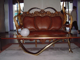 SAN FRANCISCO, CALIFORNIA/CLIFT HOTEL: I hit the jackpot in the lobby of the Clift Hotel with a potpouri of neat seats. The hotel, a few steps from Union Square, exudes old-world hotel elegance with distinctly contemporary energy and glamour. Once again Philippe Starck was the “star-chitect” responsible for design that included three seats: a sexy silk chaise lounge, an oversized silk and wooden armchair, and a unique settee with horns and ostrich upholstery. I sat in all of them, but the latter was the one I wanted to take home with me.